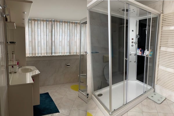 Luxe badkamer met wastafel, toilet en inloopdouche.