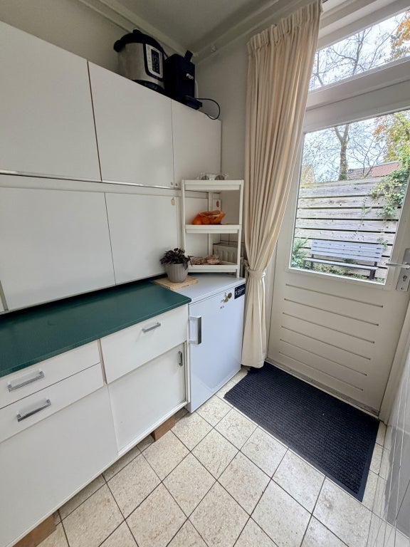 Via de ruime hal met stenen vloer betreed je de woning. Hier bevinden zich een toilet en de trap naar boven. Vanuit de hal heb je toegang tot de royale L-vormige woonkamer met grote raampartijen aan de tuinzijde en een aangrenzende werk- of speelruimte. De aparte keuken is volledig uitgerust met inbouwapparatuur. Aansluitend is er een bijkeuken met vrieskast, wasmachine en droger. Vanuit hier zijn zowel de grote tuin als de ruime garage bereikbaar. De tuin is speels ingericht met een gazon en een houten berging achterin. De garage is ideaal voor opslag, fietsen of het droog parkeren van een auto. De oprit biedt ruimte voor twee auto's.