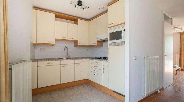 De open keuken aan de achterzijde is voorzien van diverse inbouwapparatuur, waaronder een koelkast, 4-pits gaskookplaat, afzuigkap, combi-oven en RVS spoelbak. De kasten en lades bieden volop bergruimte, en de tegelvloer maakt het geheel praktisch en onderhoudsvriendelijk.