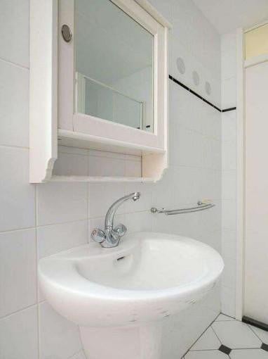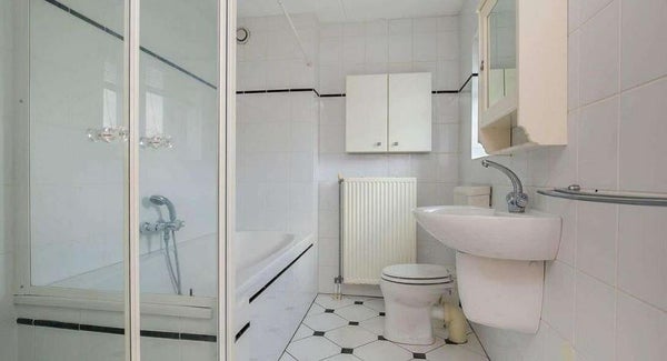 De volledig betegelde badkamer is uitgerust met een douchecabine, ligbad, toilet en wastafel.