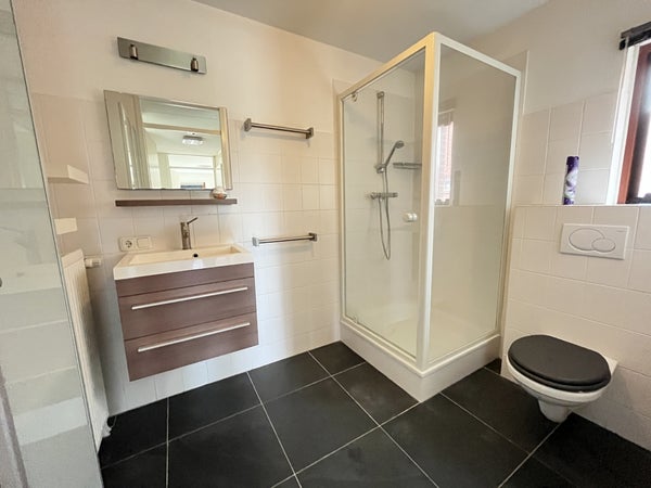 Op de eerste verdieping 3 slaapkamers van 16 m2, 12 m2 en 9 m2. Badkamer met douche, wastafel en toilet.