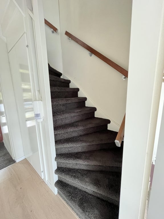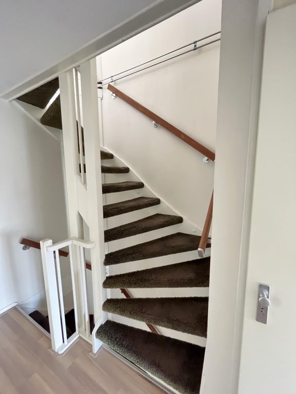 Hal met toilet en trapopgang. Toegang tot woonkamer met aan de achterzijde het woongedeelte en aan de voorzijde het eetgedeelte met de open keuken.