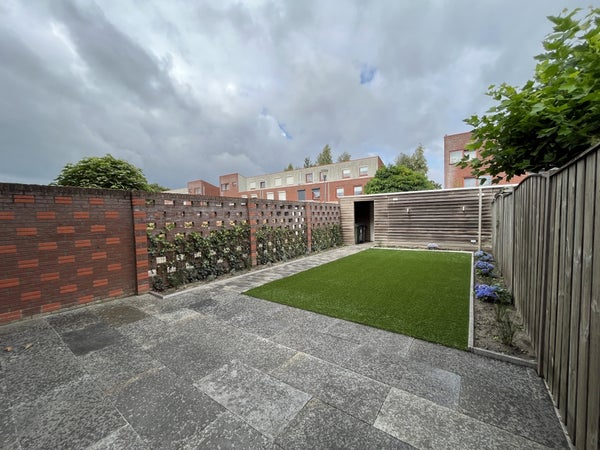 Onderhoudsarme, nieuw aangelegde achtertuin met berging en achterom.