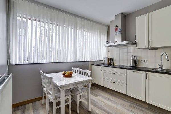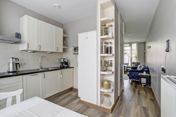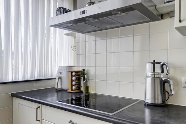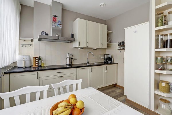 De halfopen keuken is volledig uitgerust en biedt voldoende kastruimte. Voorzieningen omvatten een inductiekookplaat, afzuigkap, wasbak met mengkraan, vaatwasser en koelkast.