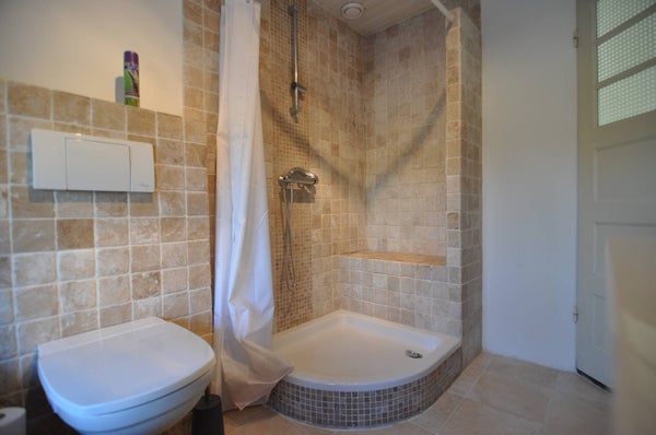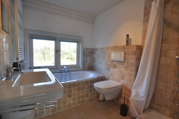 1e Etage: Mooie badkamer met o.a. getrommelde marmeren tegels, een ligbad, douche, 2e toilet en wastafel. Kinderkamer met een afmeting van ca. 8 m2 en de ouderslaapkamer is voorzien van een 2-persoonsbed. Beide kamers zijn voorzien van een laminaatvloer.