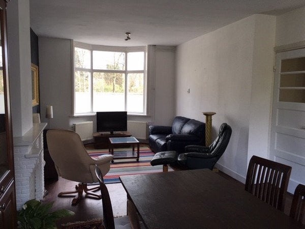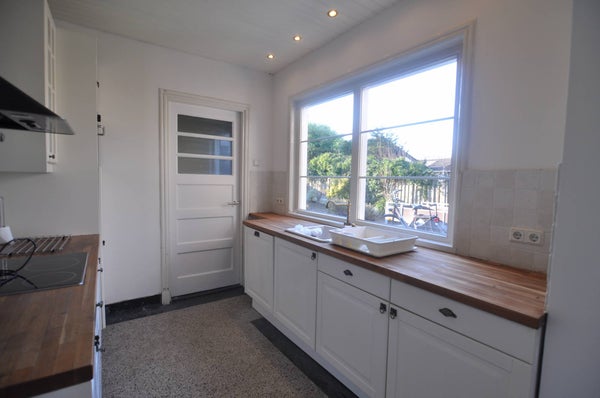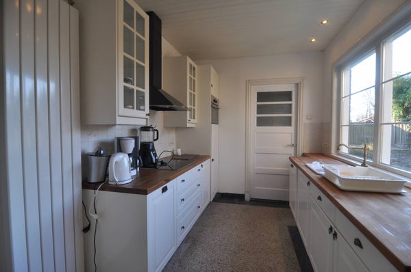 Sfeervolle woonkamer (ca. 25 m2) met een schouw, inbouwkast en houten vloer. Luxe keuken met alle apparatuur waaronder een vaatwasser, koelkast, inductie kookplaat, afzuigkap en toegang tot de kelder. Aansluitend een halletje met tuindeur, toilet en wasmachineaansluiting.