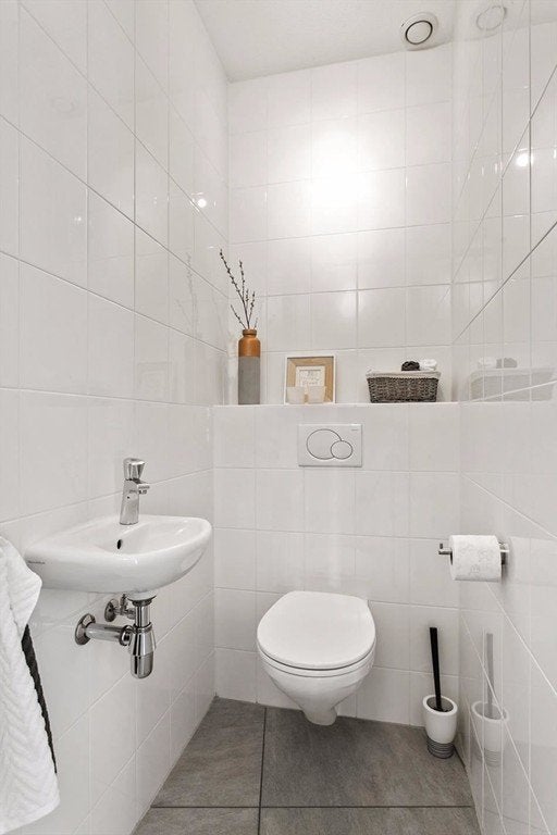 Portal with stairs to basement. Fully tiled toilet with wall closet and fountain.