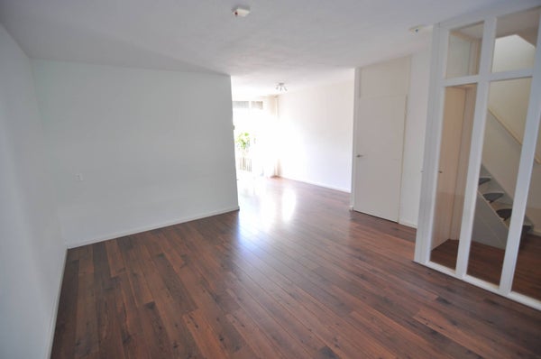 Woonkamer: Z-vormige woonkamer voorzien van laminaatvloer, prettige lichtinval via ruime raampartijen, praktische bergkast onder de trapopgang (inclusief verlichting, elektra en provisieruimte) en deur naar de achtertuin met (handmatig) bedienbare rolluiken.