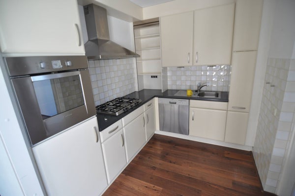 Keuken: Aan de achterzijde gelegen, half open keuken voorzien van laminaatvloer en lichte keukeninstallatie in L-vorm met diverse onder- en bovenkasten, apothekerskast, laden, kunststof werkblad, betegelde achterwand, rvs spoelbak, 5-pits gaskookplaat, vaatwasser, rvs afzuigschouw, koelkast en oven.