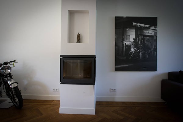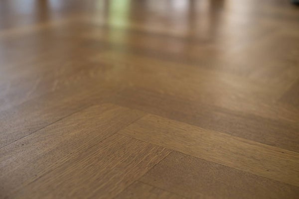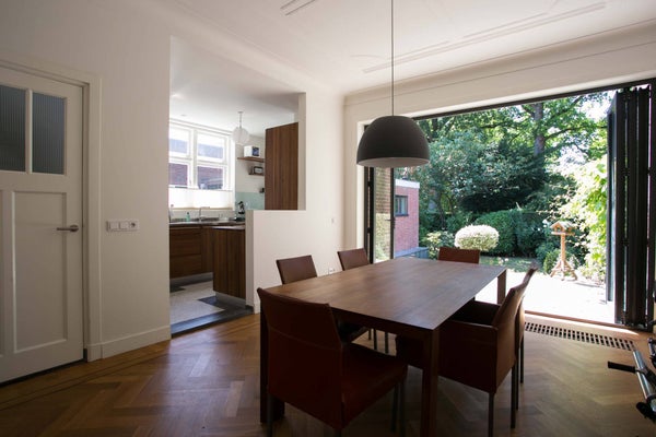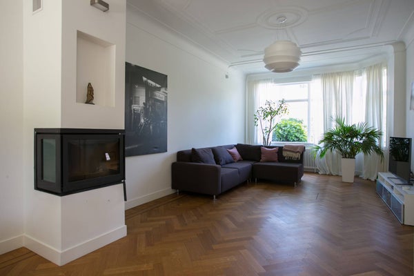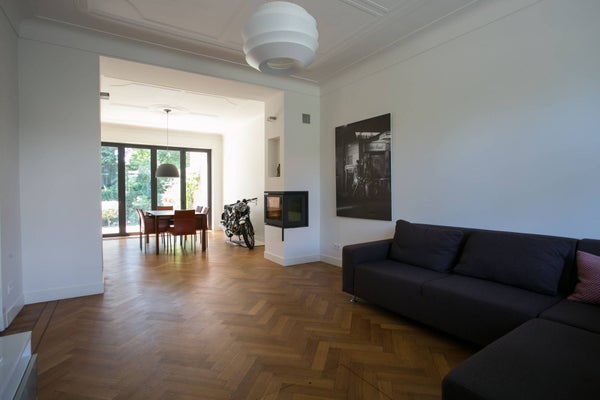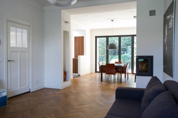 De zeer riante woonkamer is speels van indeling en biedt u de gelegenheid om op verschillende plaatsen van deze kamer te genieten. De vloer is belegd met een prachtige visgraat parketvloer inclusief bies, een haard en de wanden zijn afgewerkt met strak stuukwerk. Er is volop natuurlijk lichtinval door middel van de ramen rondom, de erker aan de voorzijde en de openslaande deuren aan de achterzijde.