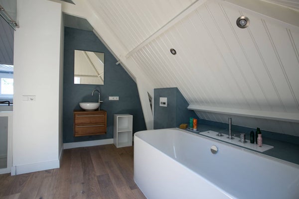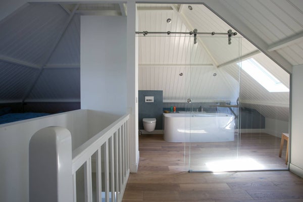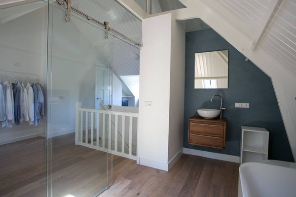 Zeer mooi afgewerkte zolderverdieping, omgebouwd naar slaapkamer met tevens een eigen badkamer. Op prachtige wijze is middels een schuifdeur constructie een glazen wand geplaatst die onderscheid maakt tussen slaap en badkamer.