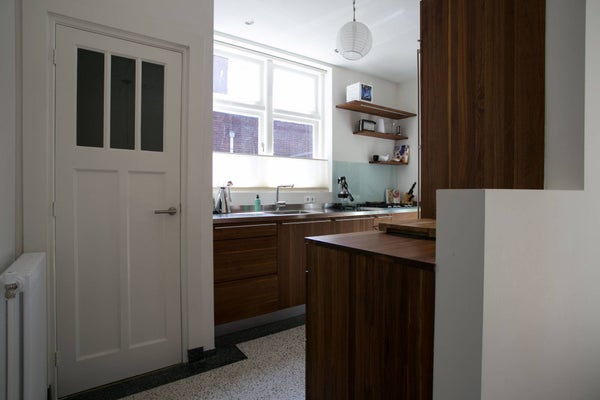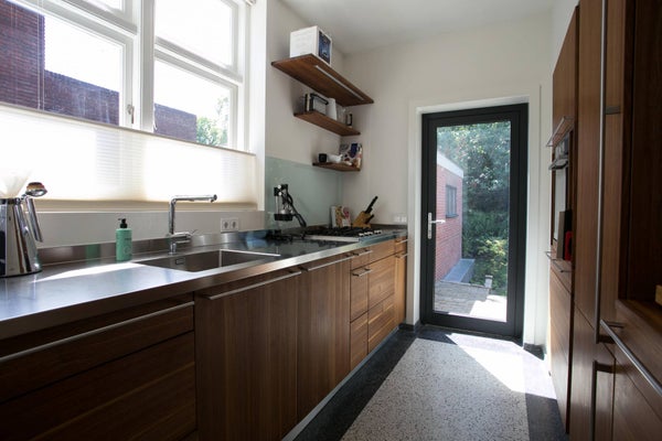 Aan de achterzijde van de woning treft u de moderne keuken met mooie houten afwerking, voorzien van alle gewenste inbouwapparatuur, waaronder een vaatwasser, 5-pits gasfornuis, koelkast, vriezer en magnetron-oven combinatie.