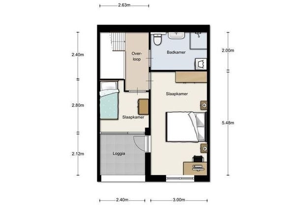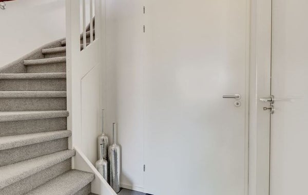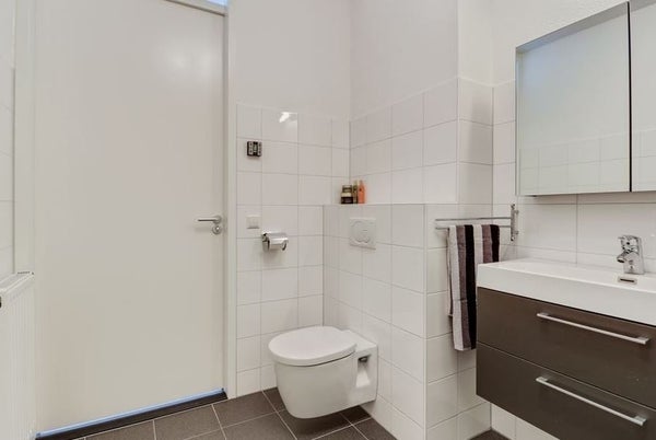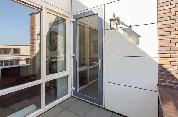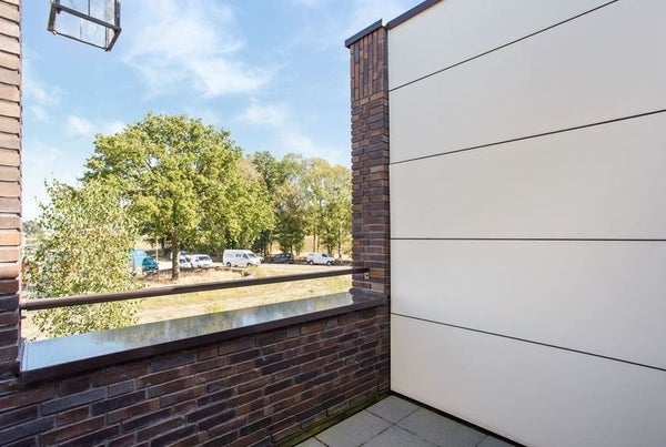 Grote overloop naar twee slaapkamers en de badkamer. Slaapkamers met laminaatvloer en toegang tot het dakterras (ca. 5m²). Het dakterras is aan de voorzijde op het noordoosten gelegen en heeft een fijn, vrij uitzicht. Moderne, geheel betegelde badkamer is uitgerust met glazen douchecabine, wandcloset, meubel met wastafel en aansluiting voor de wasmachine.