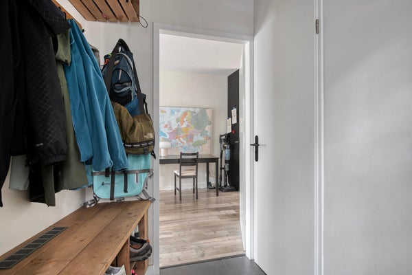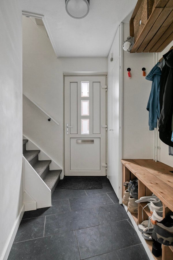 Entree woning vanaf de oprit naar de hal welke toegang biedt tot de woonkamer, het toilet en de trap naar de 1e verdieping.