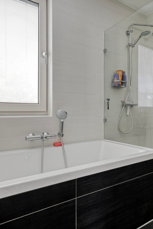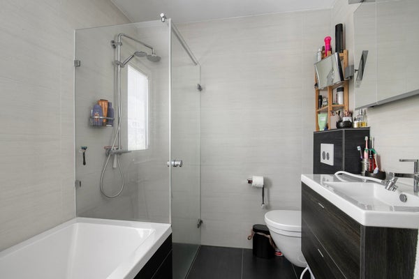 De badkamer is voorzien van een ruim ligbad, inloopdouche, modern hangend toilet en wastafel met opbergruimte.