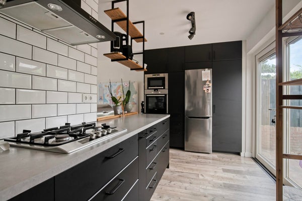 De fraaie, oversized keuken is recentelijk volledig gemoderniseerd en beschikt over alle gewenste inbouwapparatuur waaronder een vaatwasser, 4-pits gasfornuis, koelkast, vriezer, magnetron en aparte oven. Alles in een chique zwart/wit kleurenschema, het is de droom van elke thuiskok!