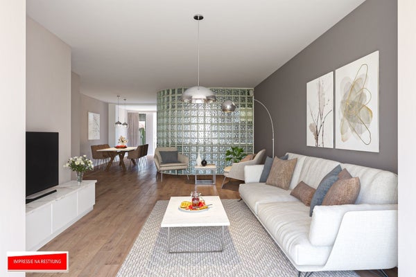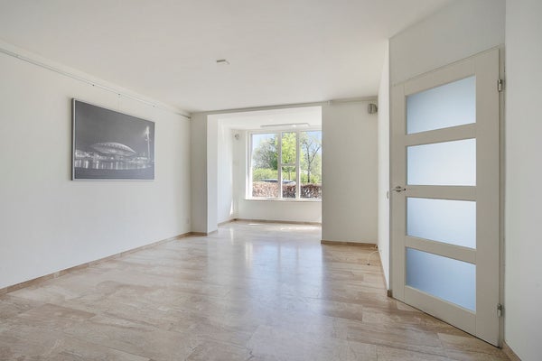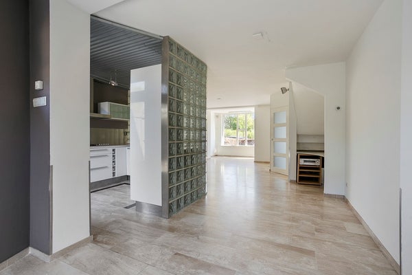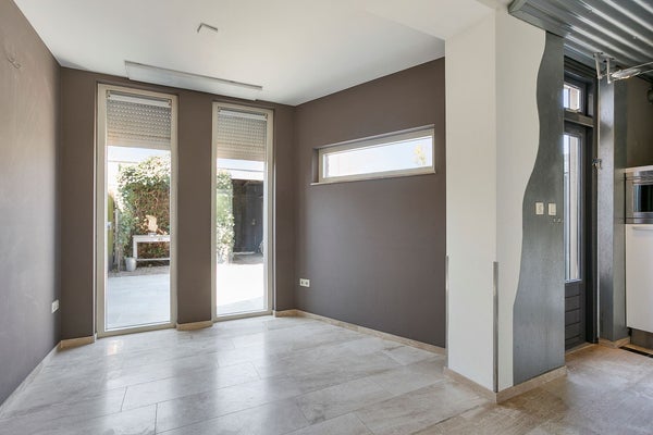 De ruime woonkamer is voorzien van grote raampartijen aan de voorzijde. Aan de achterzijde is een ruime aanbouw gerealiseerd met plafondhoge raampartijen, waardoor de woonkamer geniet van erg veel lichtinval.
