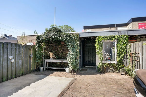De onderhoudsvriendelijke achtertuin is voorzien van grijze siertegels. Achter in de tuin is een houten berging voor het opbergen van de tuinspullen. Ook is er een stenen berging aanwezig, voorzien van elektra en een naastgelegen achterom.