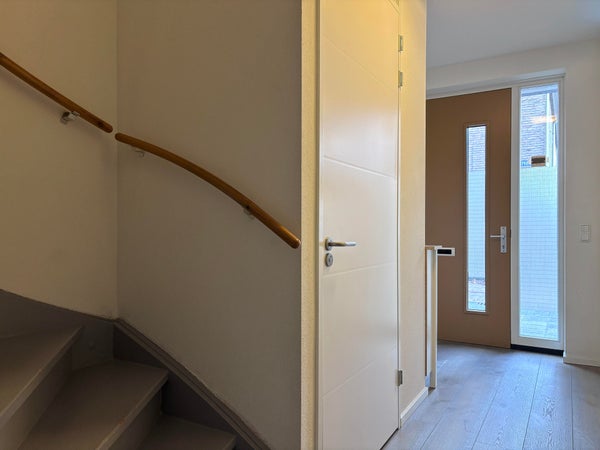 Ontvangsthal met ruimte om jassen op te hangen, toegang tot het toilet met wastafel, praktische bergruimte, trapopgang naar de eerste verdieping en toegang tot de woonkamer.