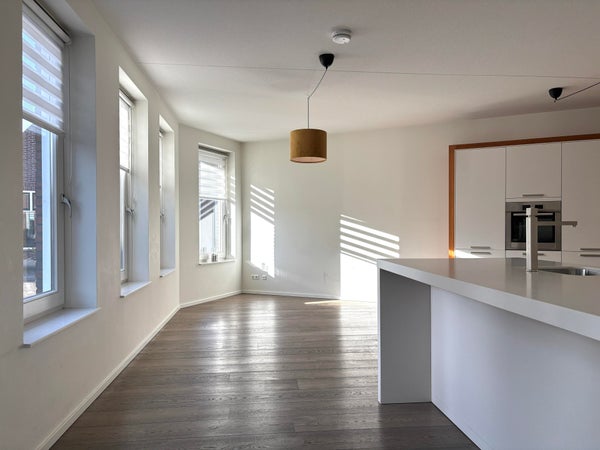 De lichte woonkamer geniet van veel natuurlijk zonlicht dankzij de vele raampartijen en staat in open verbinding met de ruim opgezette woonkeuken.