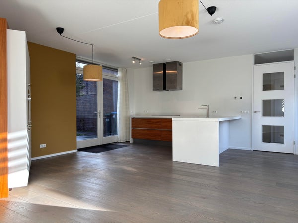 De moderne woonkeuken is voorzien van een wastafel, inductiekookplaat, afzuigkap, vaatwasser, koel-vriescombinatie, combi-oven en voldoende werk- en bergruimte. Via de openslaande deuren betreed je de tuin.