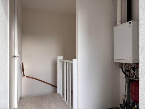 Op de overloop bevinden zich de aansluitingen voor wasmachine en droger, met toegang tot de ruime vierde slaapkamer.
