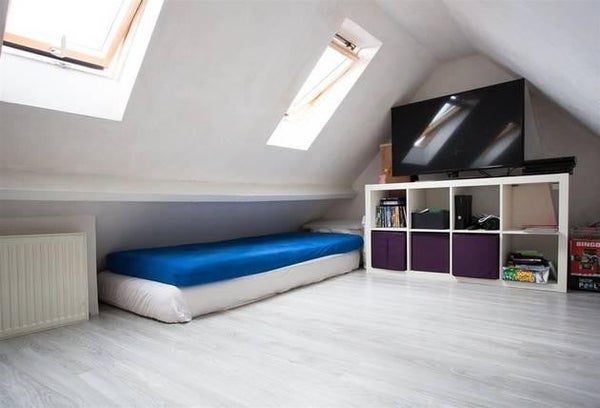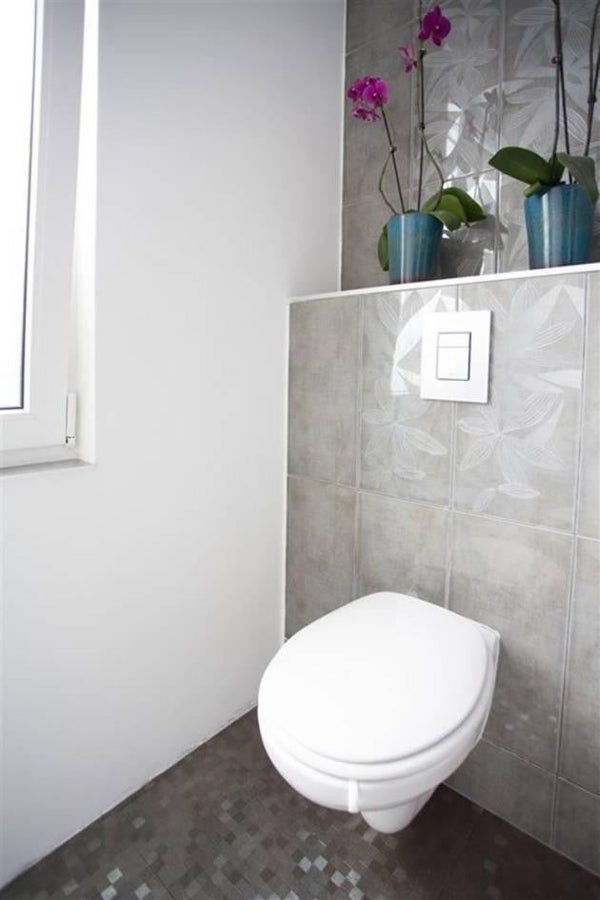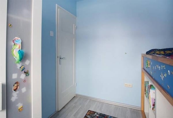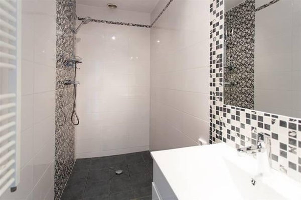 royale inloop kast. Slaapkamer 2 is gelegen aan de achterzijde van de woning en is eveneens voorzien van een laminaatvloer en beschikt over een dakkapel. Tussen beide slaapkamers is een geheel vernieuwde doucheruimte gecreëerd met een ruime douche en een meubel met vaste wastafel.