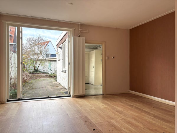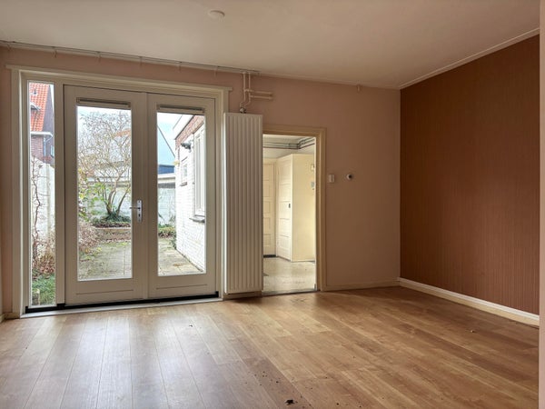 Doorzonkamer voorzien van een houten vloer, aan de achterzijde openslaande tuindeuren en open verbinding met de keuken.