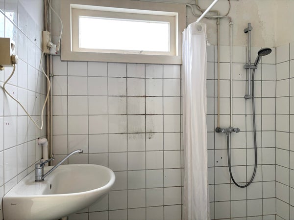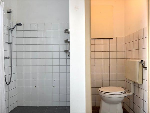 Douche, toilet en wastafel en voldoende opbergruimte.