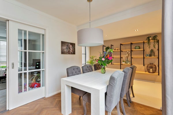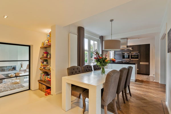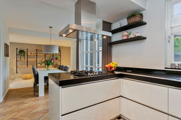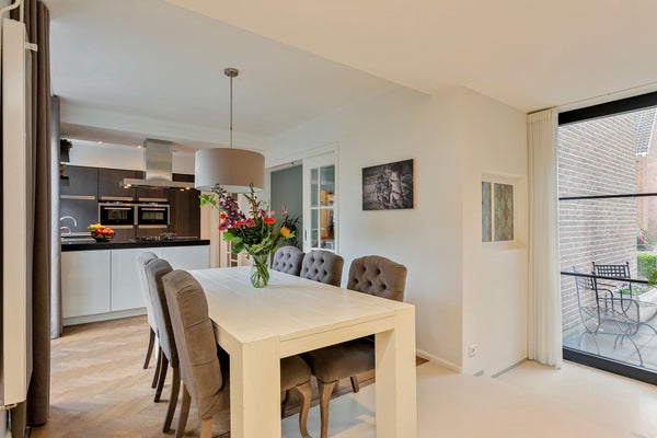 Middels originele schuifdeuren treft u de open (woon)keuken met een prachtig kookeiland. De keuken is voorzien van alle gewenste apparatuur, waaronder een vaatwasser, 4-pits gasfornuis, Qooker, vaatwasser, koelkast, vriezer en twee magnetron-oven combinaties.