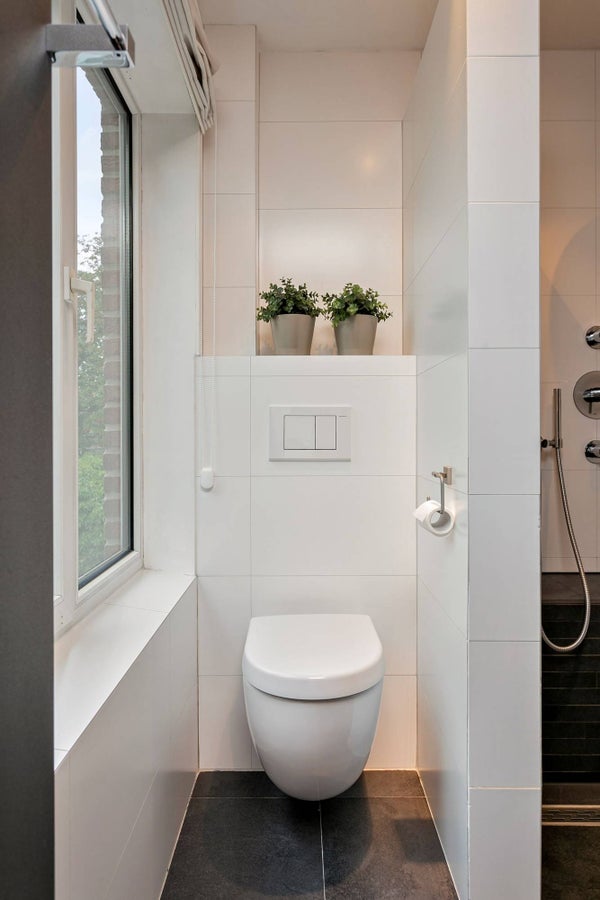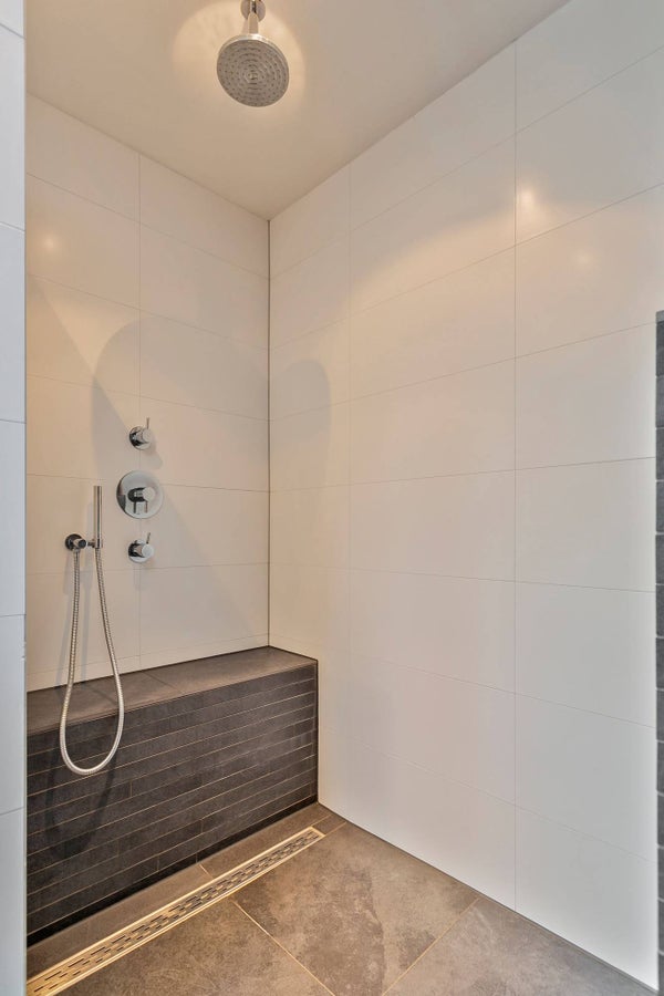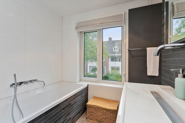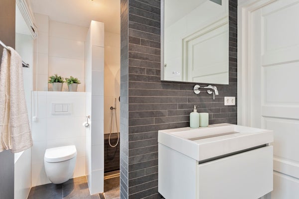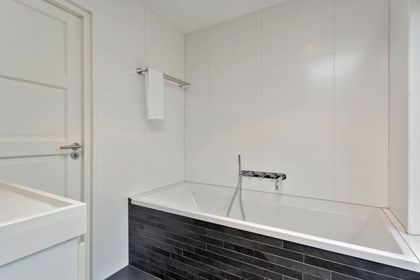 De badkamer is volledig betegeld en is voorzien van een ligbad, inloopdouche, hangend toilet en wastafel met ombouw.