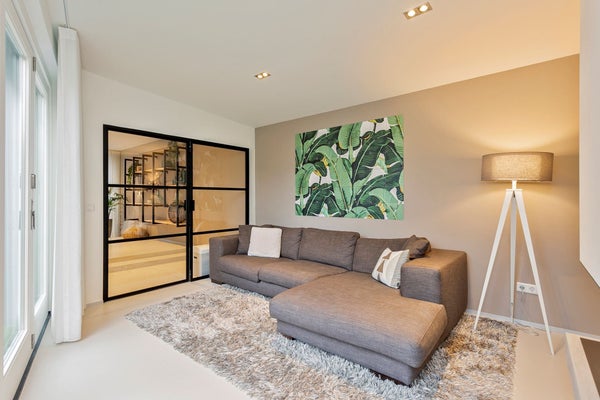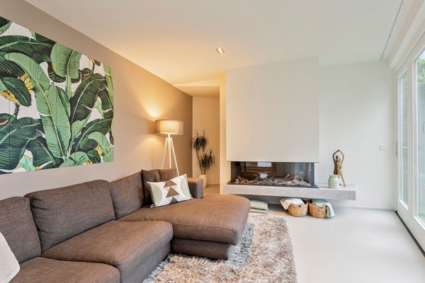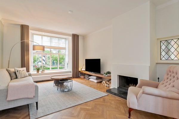 De woonkamer is volledig voorzien van een strakke houten vloer in visgraat structuur en loopt van de voor naar achterzijde van het pand. Het leefgedeelte aan de voorzijde van de woning beschikt tevens over een open haard.