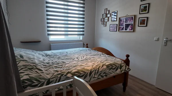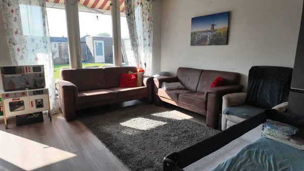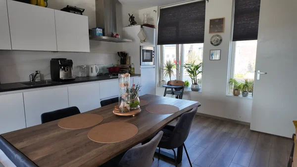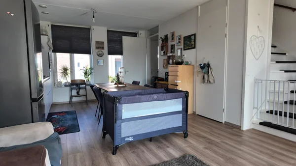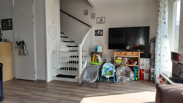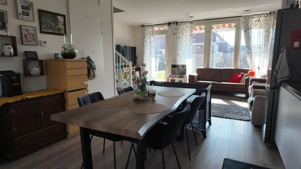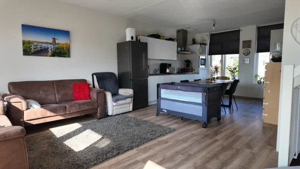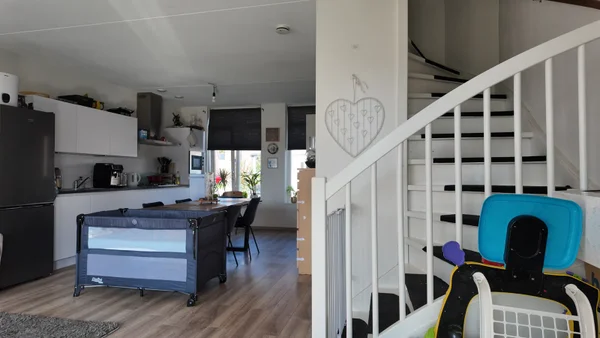 Nieuwbouwwoning met op de begane grond een hal, toilet, woonkamer met open keuken en tuin met tuinberging, drie slaapkamers, tweede toilet en badkamer op de eerste etage en een grote zolderkamer op de tweede etage.