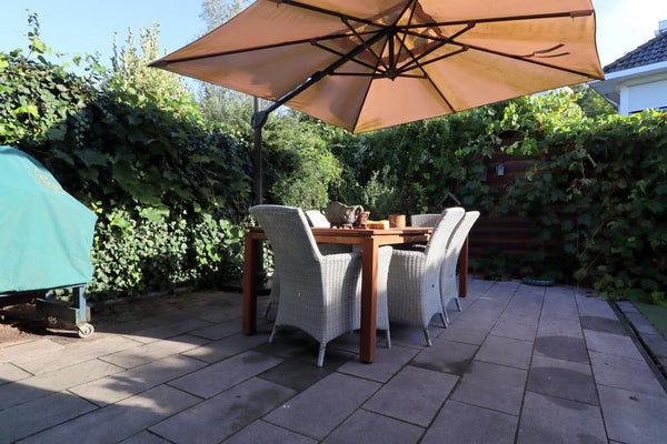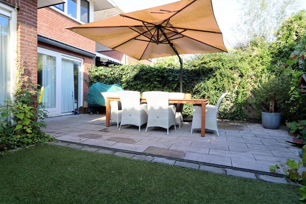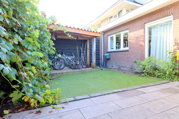 Voortuin met terras, groenborder en eigen oprit. Half betegelde achtertuin met kunst gazon en houten overkapping.
