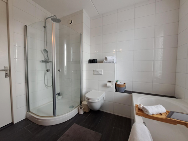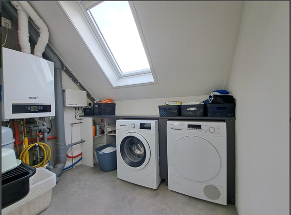 Begane grond: Inkomhal, toegang tot de lichte en ruime woonkamer met een luxe open keuken met kookeiland en bar. De keuken is volledig uitgerust met een koelkast/vriezer, oven, gaskookplaat met 5 pitten, afzuigkap en boiler/koker. De woonkamer bevindt zich aan de achterzijde en biedt toegang, via grote glazen schuifdeuren, tot de afgesloten achtertuin met verschillende terrassen, een opslagruimte en privé parkeerplaatsen. Eerste verdieping: Overloop, ouderslaapkamer aan de voorkant met een dubbel bed, tweede slaapkamer (kinderslaapkamer) aan de achterzijde, en een derde kamer die momenteel als kantoor wordt gebruikt. Luxe badkamer met inloopdouche, aparte badkuip, tweede toilet, handdoekradiator en wastafel. Tweede verdieping: Overloop met toegang tot alle kamers, aparte wasruimte met wasmachine en droger. Twee extra slaapkamers van vergelijkbare grootte (elk met een eenpersoonsbed) en een tweede badkamer met douche, toilet en wastafel.