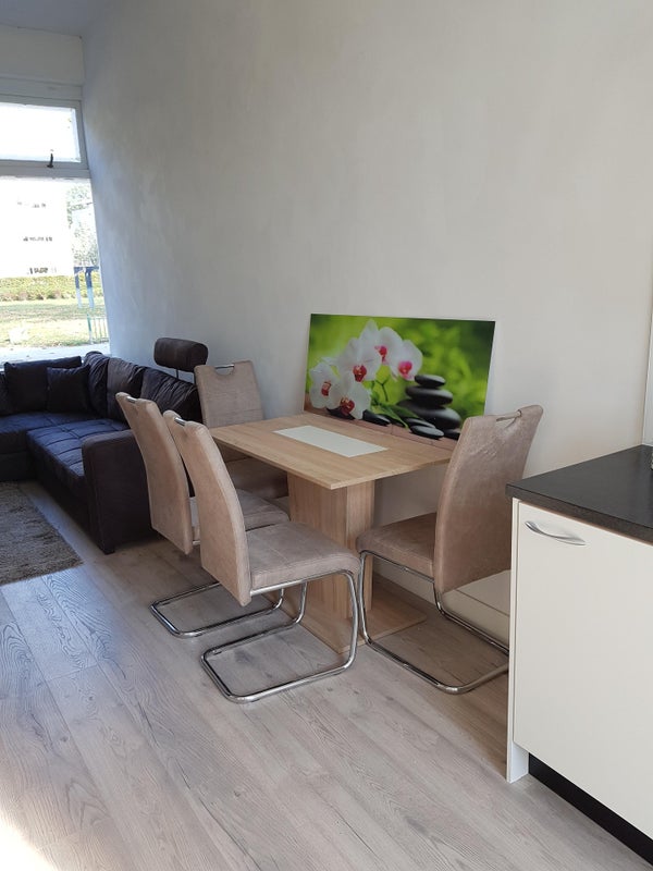 Een woonhuis met drie woonlagen; begane grond met woonkamer en keuken. De luxe keuken is uitgerust met inbouwapparatuur (elektrische kookplaat, afzuigkap, vaatwasser en koel-vriescombinatie). Eerste verdieping heeft een open slaapkamer, badkamer en opslagruimte + wasmachine. De badkamer beschikt over een inloopdouche, wastafel, ligbad en een kast. Tweede verdieping heeft ook een open slaapkamer.