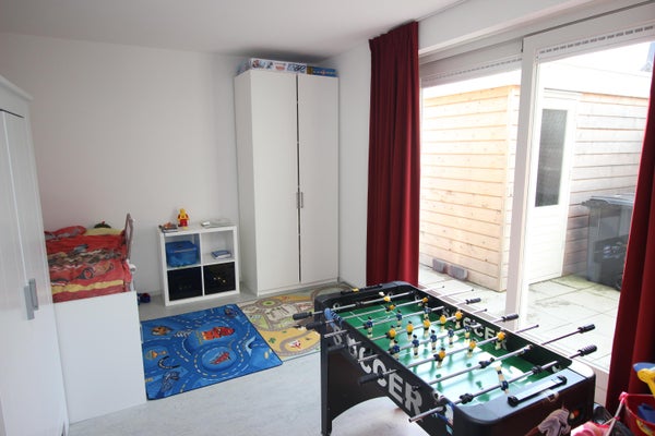 Vanuit de zithoek toegang naar de gang. De gang biedt toegang naar de berging (ca. 3m²), een separaat toilet, de eerste slaapkamer (ca. 15m²) met een schuifpui naar de tuin en de trapopgang naar de eerste verdieping.