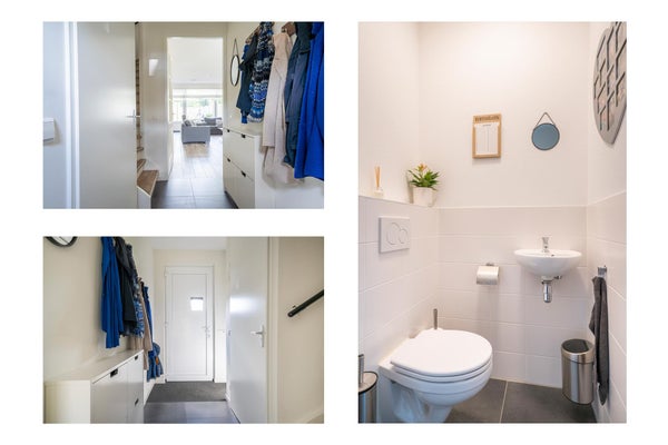 Entree, toiletruimte en trapopgang naar de verdieping. De woning heeft een lichte woonkamer met open keuken, waardoor de leefruimte ruim en gezellig aanvoelt. De open keuken is voorzien van moderne opstelling met inbouwapparatuur en biedt voldoende kastruimte. Via de woonkamer stap je zo de achtertuin in – een fijne plek om in de zon te zitten of gezellig te eten op warme dagen.