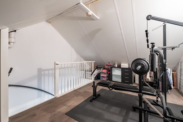 De zolderkamer is ca. 11 m2 en kunt u op vele manieren gebruiken. Zo is de zolder momenteel in gebruik als sportkamer. Maar u kunt hier bijvoorbeeld ook een speelkamer of kantoorruimte van maken. Of natuurlijk gewoon extra spullen bergen. De c.v.-installatie en de mechanische ventilatie zijn vernuftig weggewerkt.