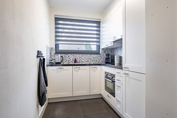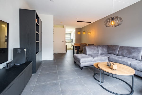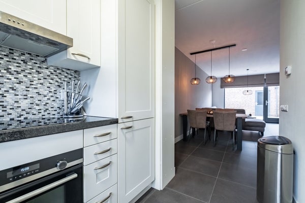 De open keuken bevindt zich aan de voorzijde van de woning en beschikt over meerdere onder- en bovenkasten waar u uw keukengerei kwijt kunt. Daarnaast is de keuken uitgerust met een vaatwasser, 4-pits inductiekookplaat, afzuigkap, combioven, koel-/vrieskast, spoelbak, betegelde achterwand en een granieten aanrechtblad.