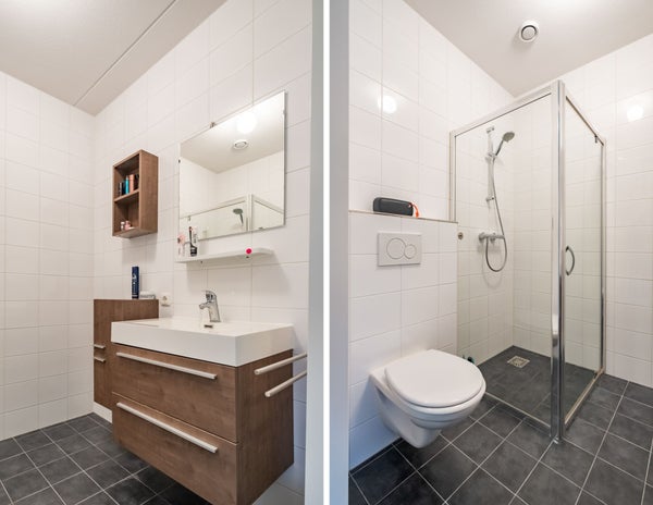De geheel betegelde badkamer is uitgerust met een douche, vrijhangend toilet, wastafel met meubel en mechanische ventilatie.