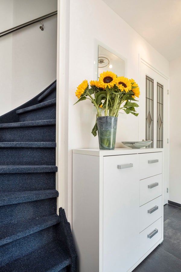 Overdekte entree; royale hal voorzien van tegelvloer met vloerverwarming, meterkast en trapopgang naar 1e verdieping.