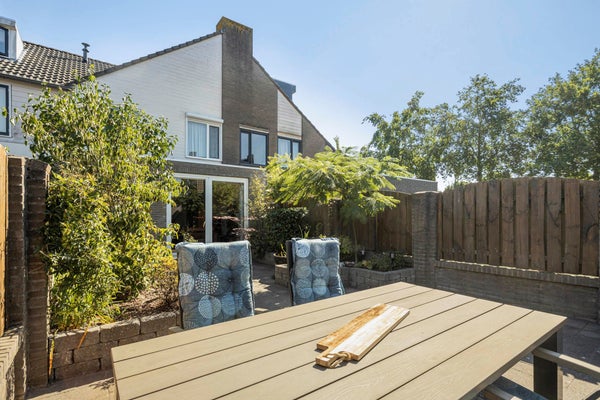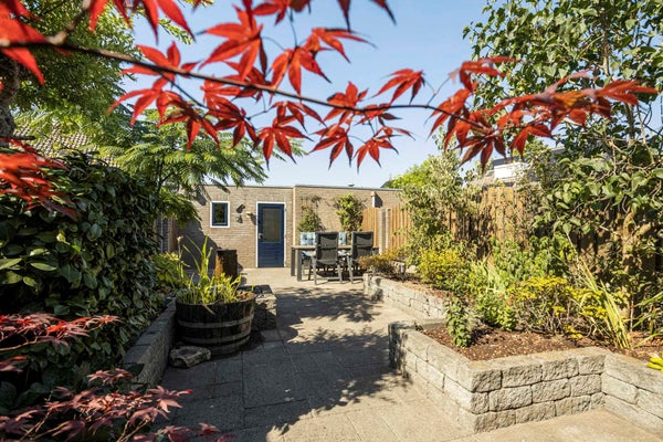 De achtertuin is voorzien van terrassen, borders met beplanting en zeer royale berging, ± 15 m². Via een deur in de berging bereikt men de achterom.