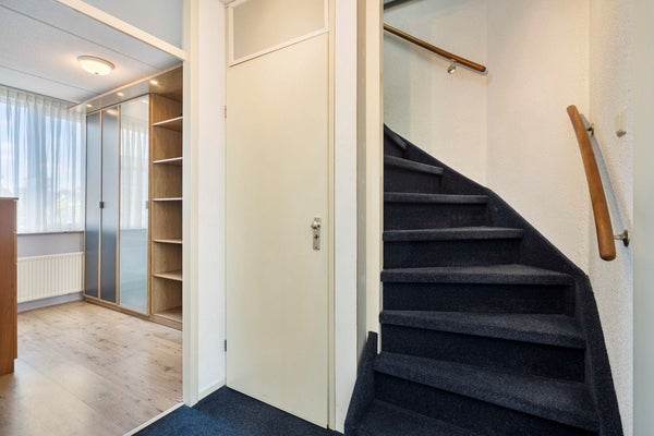 Ruime overloop met vloerbedekking en praktische kast.
