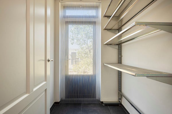 Praktische bijkeuken, ± 2,6 m², met deur naar de tuin.