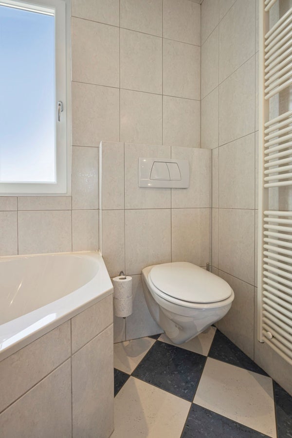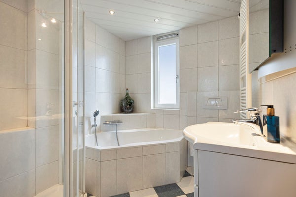 Nette tot plafond betegelde badkamer, ± 5 m² voorzien van ligbad, wandcloset, badmeubel met wastafel en designradiator.