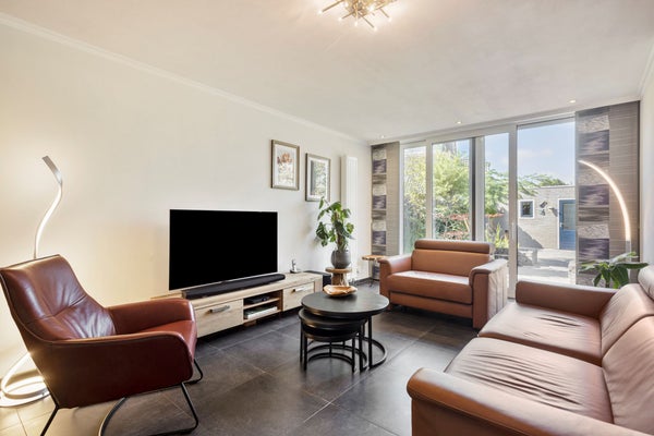 Royale, over de volle breedte uitgebouwde woonkamer, ± 41,3 m² incl. keuken, voorzien van tegelvloer met vloerverwarming, ruime trapkast en schuifpui naar de fraaie tuin.