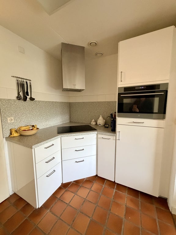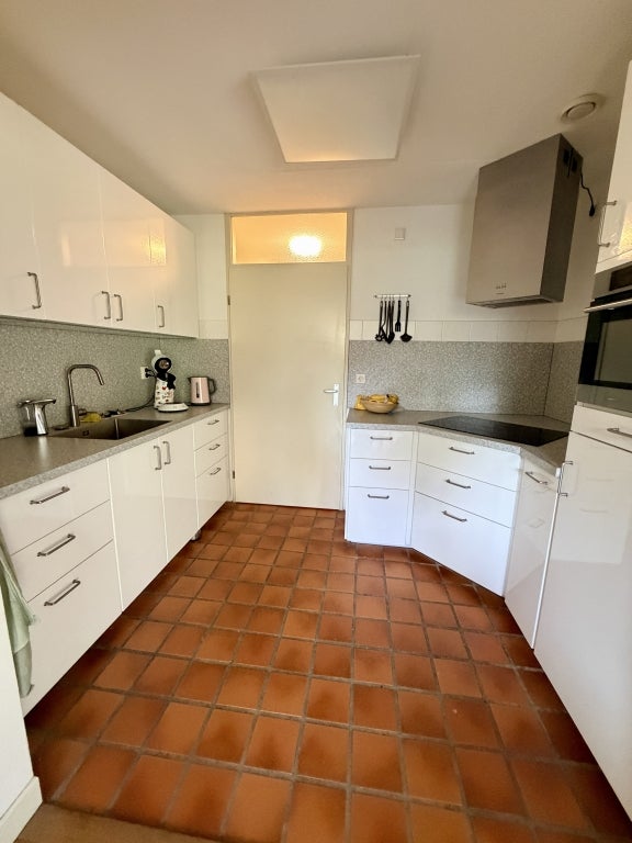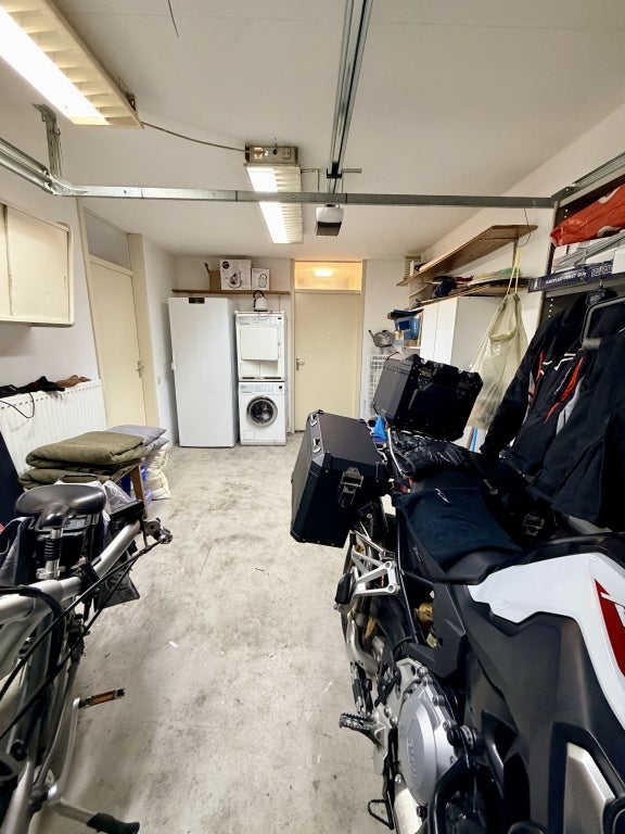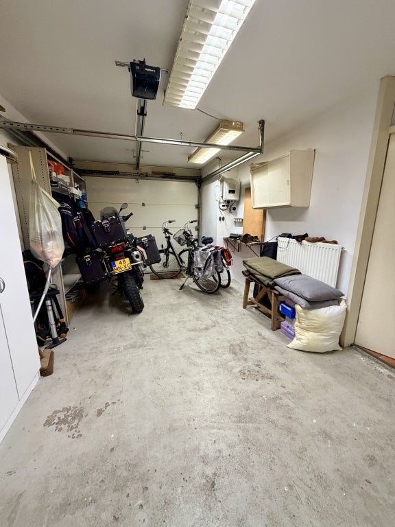 Lichte woonkamer met Franse eiken vloer en uitzicht op de tuin, open keuken met inductiekookplaat, oven, koelkast, close-in boiler en nieuwe afzuigkap. Verder een slaapkamer met ensuite badkamer, een 2e separaat toilet, bijkeuken met Miele was- en droogmachine, inpandige garage met elektrische garagedeur en diepvries.