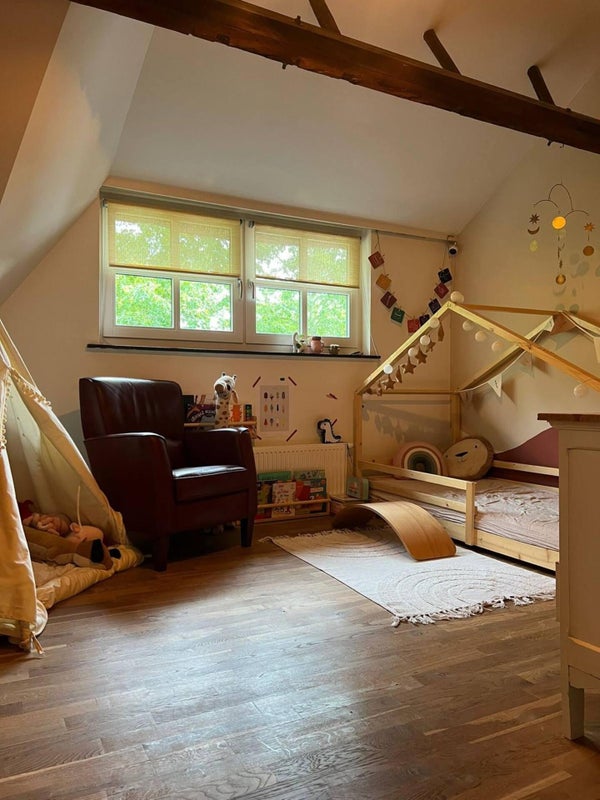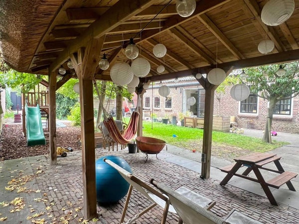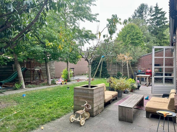 De tuin is ruim en goed onderhouden, met een barbecue en een uitgebreide kinderspeelplaats met schommel, trampoline, zandbak, glijbaan en boomhut. De locatie aan de rand van Geldrop en Eindhoven biedt veel groen, terwijl het centrum van Geldrop binnen 5 minuten bereikbaar is. Eindhoven ligt op slechts 10 minuten fietsen of 6 minuten met de trein, waardoor stad en natuur perfect samenkomen.