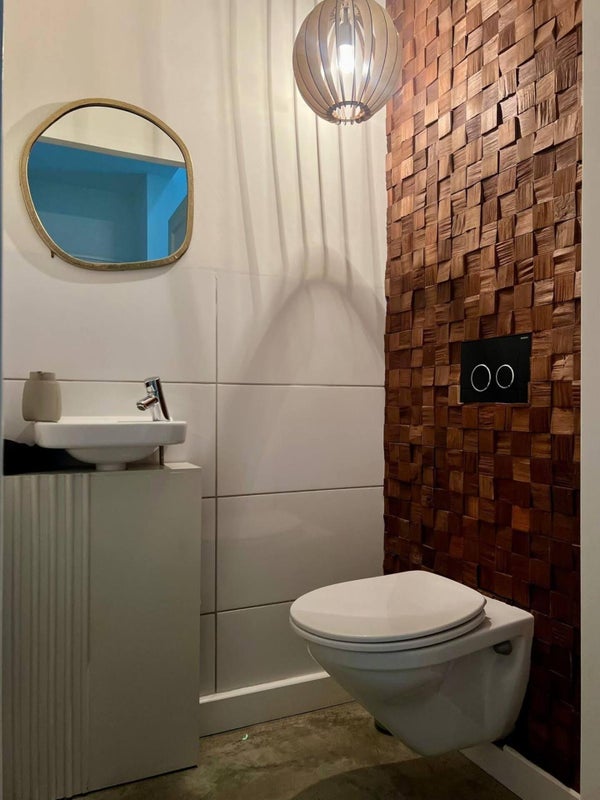 De complete badkamer heeft een aparte douche en bad, aangevuld met drie extra toiletten met wastafel, waardoor het huis uitermate geschikt is voor gezinnen.